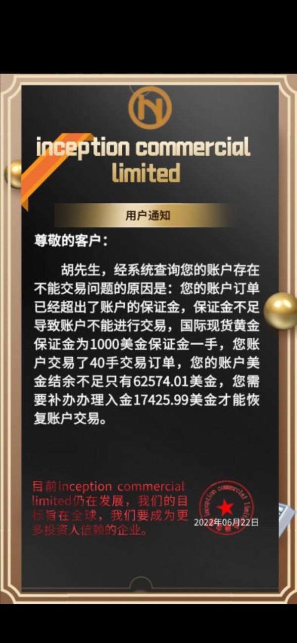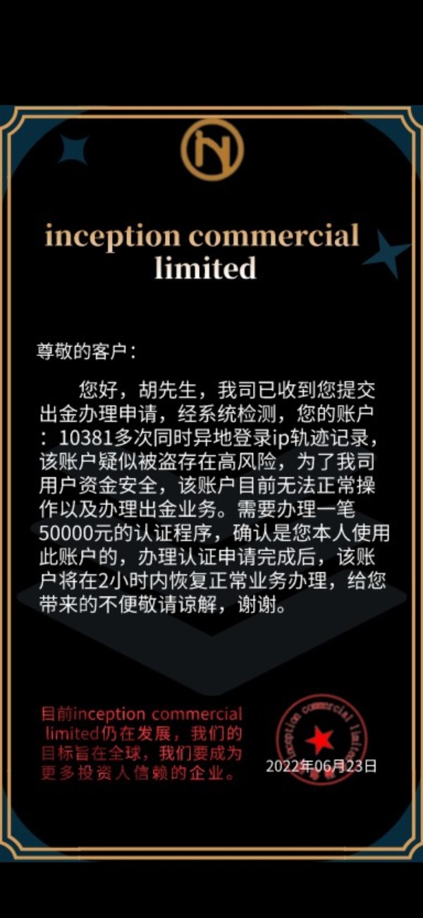 该公司(incetion commercial limited)初次操作40手看多,40手看空,账上结余62574美金,净值57734,这在任何期货平台应该都是可以操作的,结果以我仓位过重强行封了我账户,需要入账1.7425万美金才解仓。解仓后我准备取现,又以我账户存在ip(我人在境外)风险需要交代50000人民币后才能办理取现业务,再次缴纳完后,最后要求我充值增资的形式交纳个人所得税$5000为理由,拒绝我提现人民币50万的申请,冻结我的交易账户,并且申称不补齐,冻结我账户剩余美金资产和国内银行卡账户,侵占我账户的所有资金,共计 $87150.35, 其中含个人投资金额 $52293.85, 以及从黄金期货XAUUSD交易中的获利 $37639.50。个人所得税不能从投资获利中扣除,而是另外充值交税,这就是“先筹钱交税再领中奖”的诈骗如出一辙