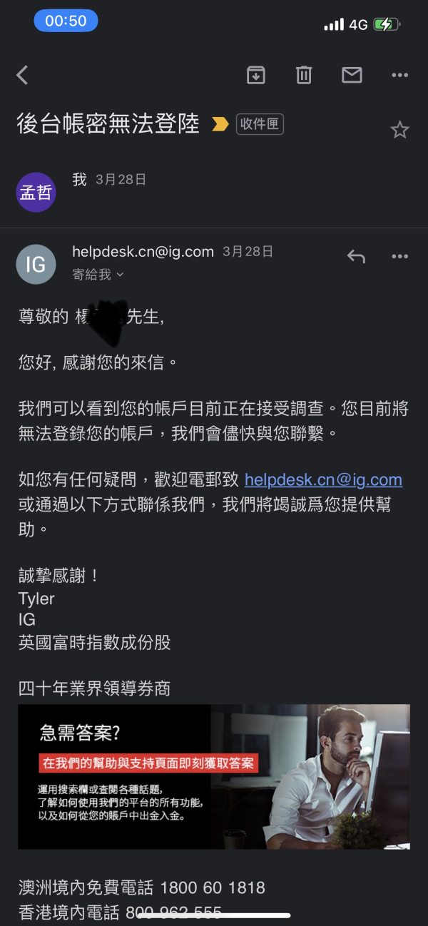 申请出金已經好幾天了,尚未出金,也不回覆 你們就直接凍結我的交易赈户,不能進行交易, 你們甚至還竄改我帳戶交易紀錄,把我的交易帳號從獲利變成是虧損。 請問這是正規券商會做的事嗎? 這就是全球知名的券商IG的行事作風嗎?