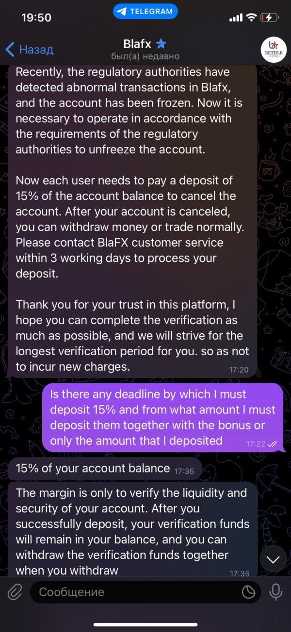 Сначла заблокировали вывод средств под предлогом акции, сегодня сайт отключили от mt4 вывод средств невозможен, обращался в поддержку, требуют 15% от депозита, чтобы не заморозили аккаунт, так как слишком много транзакций на сайте и орган регулирования заблокировал его. Поддержка только удтверждает, что нужно внести деньги и все