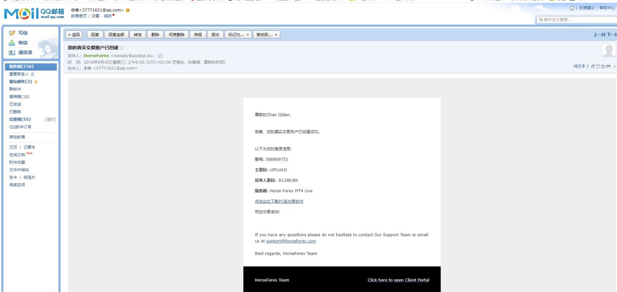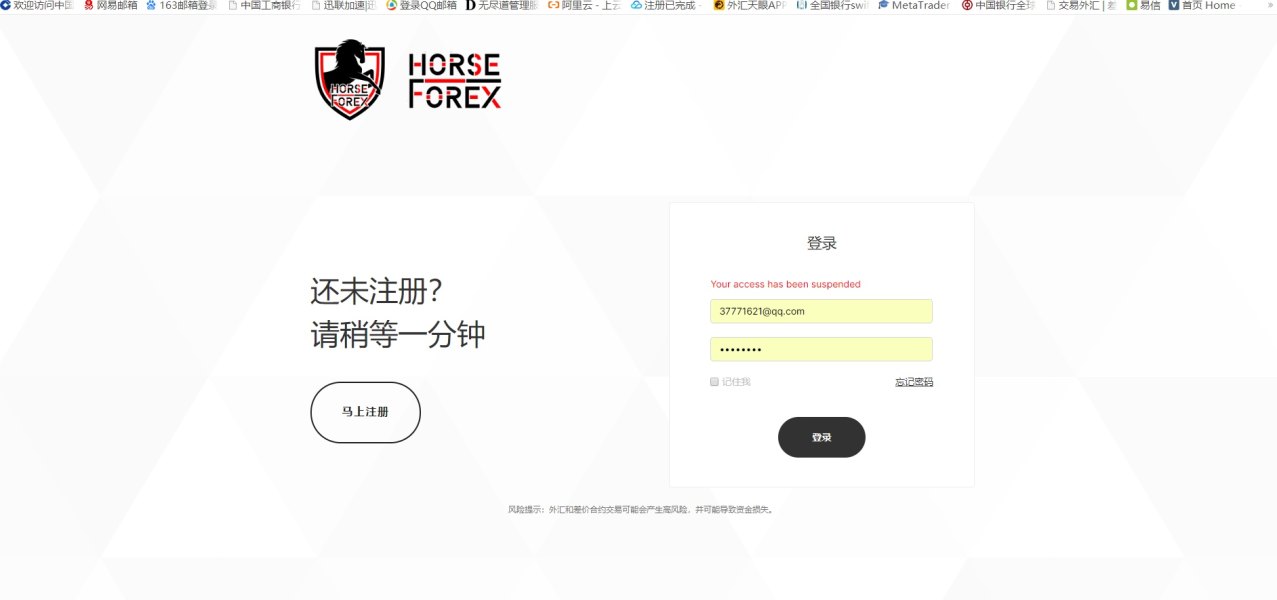 这平台非常黑,一入金赚点钱,就无法登陆,然后问官网客服,客服叫找业务经理,业务经理直接失联, 账号: 588809778 主密码: 0b0cd8qP 投资人密码:b4b15f8F 服务器: Horse Forex MT4 Live