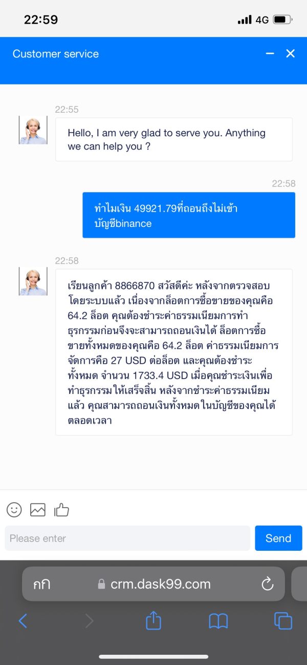 ดิฉันได้รับคำแนะนำการเทรด forex เงินลงทุนทั้งหมด 475,000 บาท นำไปซื้อเหรียญผ่าน binance ประมาณ 12179 usdt เทรดผ่าน MT5 ได้กำไร 37742 usdt รวมเงินที่ต้องได้ 49921 usdt พอจะถอนเงินผ่าน dask99 แจ้งว่าต้องจ่ายค่าธรรมเนียม ราคา 1733.4 usdt หลังจากจ่ายไปแล้ว ยังไม่ให้ถอนแจ้งว่าต้องจ่ายภาษีจำนวน 7548.46 usdt ถึงจะถอนเงินทั้งหมดได้ ดิฉันไม่สามารถจ่ายได้ ทางbroker แจ้งว่าจะปิดระบบ วันที่ 15 June 2022 และจะไม่สามารถถอนเงินได้อีกต่อไป ตอนนี้คิดว่าต้องถูกโกง จึงยื่นเรื่องให้ช่วยดิฉัน ให้ได้รับเงินคืน