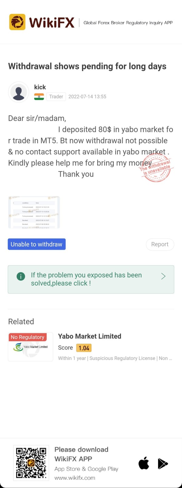 Dear sir/madam, I deposited 80$ in yabo market for trade in MT5. Bt now withdrawal not possible & no contact support available in yabo market . Kindly please help me for bring my money Thank you