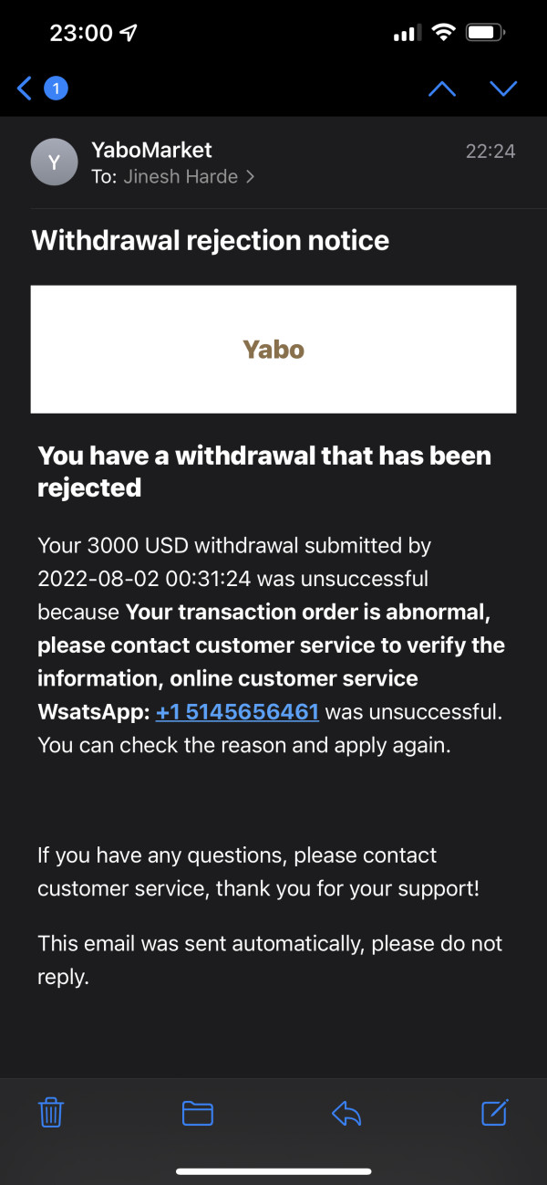 L'utilisateur n'a pas prouvé être un commerçant YABO MARKET LIMITED