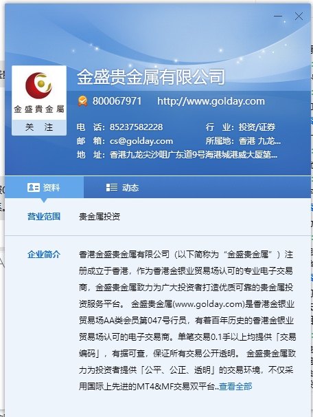 香港金盛贵金属有限公司(注销) 深圳市金盛前海金融服务有限公司(经营异常) 深圳前海金盛贵金属有限公司(注销) 金盛富盈投资有限公司(注消) 1.香港金银业贸易场只是行业协会,并不是政府的监管职能机构,没有任何的监管职权。 2.贸易场的理监事会的成员全部都是各黄金公司的负责人,既是运动员又当裁判,无法保证监管的公正和透明。 3.香港证监会规定金融投资只能最高20倍杠杆,但是香港金银业贸易场的黄金保证金公司基本都是100倍杠杆,大大超过了香港证监会规定。 4.香港的黄金交易公司很多都用个人的中转银行接收汇款,并且可以用第三方汇款,完全没有遵守国际间对洗钱和金融风险控制的规定。 5、金盛贵金属直播间讲课业务员引导导致我亏损60多万人民币,我会向深圳公安机关报案