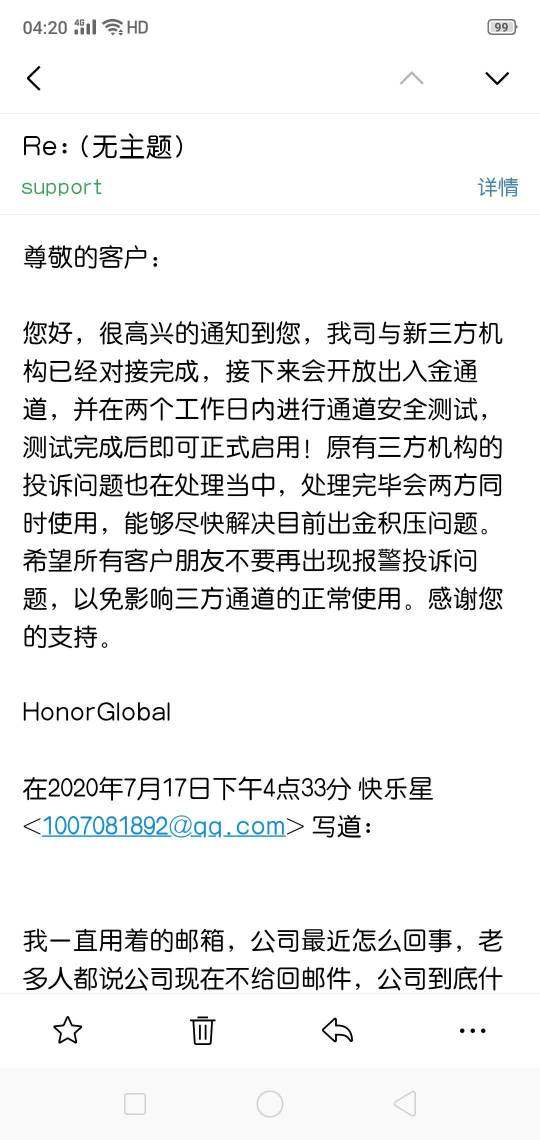 Le retrait appliqué le 19 avril n'a pas encore été reçu. Honor Global l'a retardé jusqu'en septembre. C'est simplement une routine. Des centaines de milliers de fonds n'étaient pas disponibles. Le service m'a fait chanter pour ne pas appeler la police. Je suis inquiet maintenant.