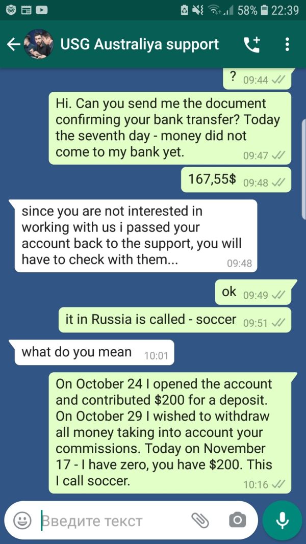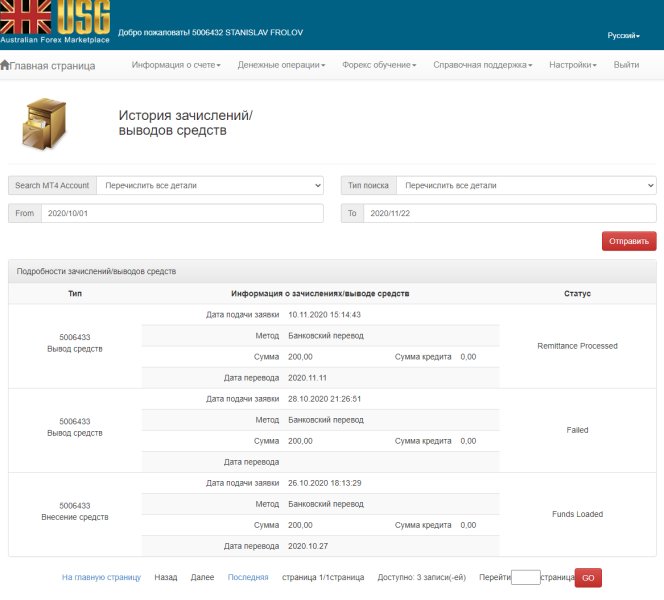 I deposited funds for the trial of $ 200 by Bank transfer on October 26 and on October 28 I made a request to withdraw all funds of $ 200. Only on November 11, I was able to register a withdrawal request - the rest of the time they rejected me pretending that they do not understand what I want. And another important point - they have unspoken rules that I have not published anywhere on their site - if you Deposit funds and then ask for everything back without trading at all, then the fine is $ 25 and the Commission for withdrawal is $ 7.25. In total, I should have received$167.55 on my hands back without trading. This is a robbery I know and I agreed -but still they do not send anything just pretend that everything is in progress. A screenshot of the transaction are making