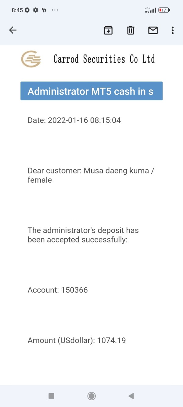 hello I start sign up on 01/16/2022 start chat with Carrod 0n -- the broker gave me the crypto wallet address to make deposit. I deposited with USDC coin $1.074 I installed MT5 account and add the Carrod live account. After see profit I start made big deposit $12.599with USDT coins. On 01/18/2022 I tried withdraw $100 from Carrodsecurities and go thru to my wallet. I start suspicion with this broker so I deside to trying again withdraw $1000. But the money never go to my wallet till now.