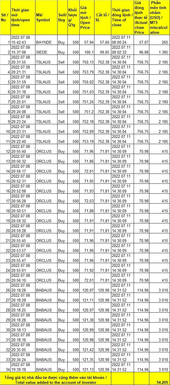 Tài khoản MT5 của tôi là 920046. Tôi tham gia từ 2/6/2022, trong quá trinh tham gia tôi thường mua cổ phiếu và đặt lệnh cắt lỗ cho mỗi cổ phiếu để tránh làm cháy tài khoản. Ban đầu phần mềm MT5 của sàn Honorfx đóng lệnh tại đúng giá mà tôi đã đặt lệnh cắt lỗ, tuy nhiên đến ngày 08/07/2022, sàn Honorfx đã can thiệp vào phầm mềm MT5 để toàn bộ giá đóng lệnh không đúng với giá mà tôi đã đặt lệnh cắt lỗ dẫn đến tài khoản của tôi đã mất đến 54 205 USD (Xem bảng tính toán chi tiết và ảnh chụp từ các lệnh đã đóng của Sàn Honorfx) Tôi đã viết thư gửi sàn qua email hỗ trợ sàn support@honorfx.com và support.vietnam@honorfx.com nhưng không có bất cừ phản hồi nào từ sàn vì vậy tôi đăng lên đây yêu cầu Sàn Honorfx trả lại tôi số tiền trên, và cũng nhắc nhở các nhà đầu tư cận trọng với sàn này kẻo cháy tài khoản