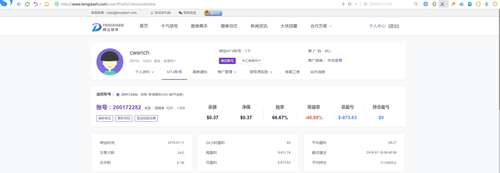 本账户于7月11日在腾达开户,开户时发现点差非常大,并且当时社区发出来的很多都是盈利的单,存在诱导客户入金交易,还有在腾达跟单和USGFX投诉要求赔偿,都不予配合客户赔偿,现在曝光两个平台之间存在利益关系