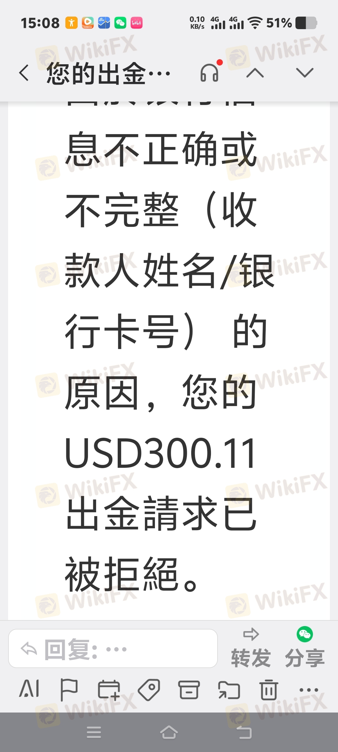 客户第二次提交出金$300.11至其中国银行卡,显示出金失败。请客户核实银行卡等正确信息,再次提交出金即可。