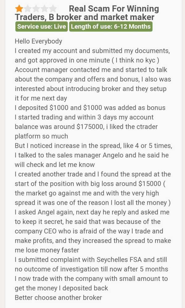 का एक ग्राहकFONDEX ने शिकायत की है कि इस ब्रोकर में निवेश करके उसे बहुत बड़ा नुकसान हुआ है और ब्रोकर इस नुकसान के लिए वैध कारण नहीं बता सकता है। ग्राहक ने इस ब्रोकर में निवेश न करने की सिफारिश की है।