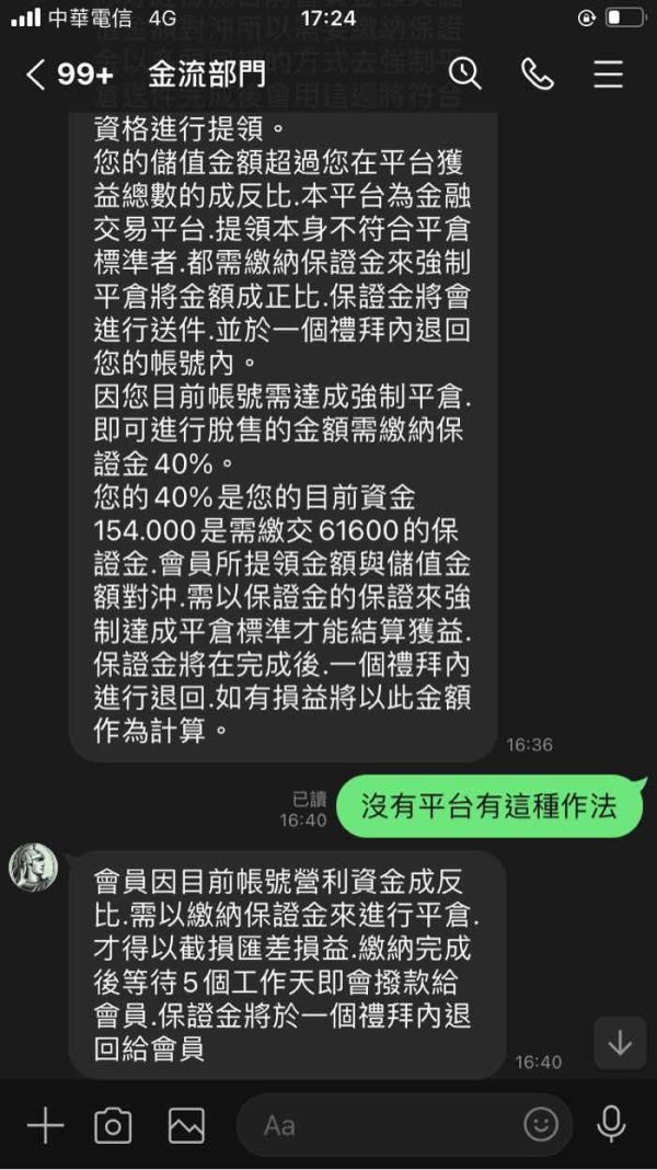 一開始兼職工作,協助僱主(詩穎)下單,中間需透過一個專員(Echo)來下單,後來因僱主說有事無法,要自己收回去做,另外給我一個名額,專員一樣抽50%的佣金,而且必須先支付佣金才能提領,後來平台(E網客服線上中心)提領跟我說要審核五天,後來審核完又轉介給金流部門,金流部門又我說要付保證金,堅持不出金