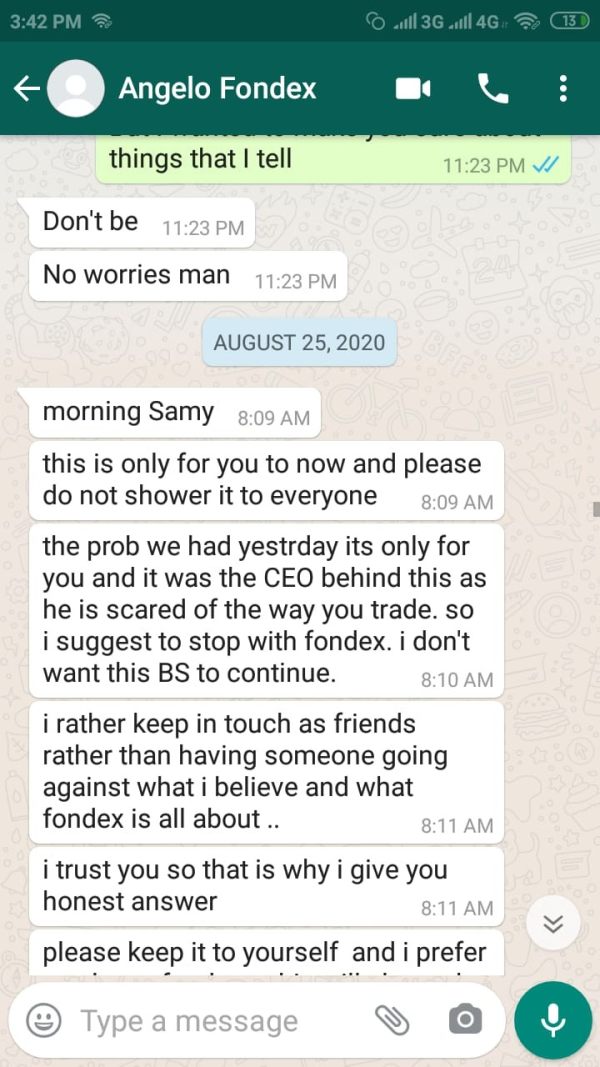 उन्होंने बस मेरी खाता सेटिंग में हेरफेर किया और एक पोजीशन खोलने पर स्प्रेड/मार्कअप को 7 गुना और उससे भी अधिक बढ़ा दिया। मैंने इन परिवर्तनों को देखा और एंजेलो (एक्स बिक्री प्रबंधक) को भेजा और उन्होंने जवाब दिया कि सीईओ इसके पीछे है क्योंकि वह जिस तरह से मैं व्यापार करता हूं और मुनाफा कमाता हूं (3 दिनों में $ 1000 से $ 175000)। और एक व्यापार में मैंने देखा कि जब मैंने अपने खाते में किए गए परिवर्तनों के कारण एक नई स्थिति खोली तो वे नुकसान में जोड़ा गया $ 15,000 काट लेते हैं और क्योंकि ctrader सिस्टम स्प्रेड की रिपोर्ट नहीं करता है लेकिन स्थिति विवरण में केवल कमीशन की रिपोर्ट करता है। उन्होंने मुझे शेष पैसे लेने के लिए कहा और नहीं उनके साथ फिर से व्यापार करने के लिए, लेकिन फिर भी मैंने शेष राशि को दूसरी स्थिति में खो दिया। मैंने उनके साथ बातचीत करने की कोशिश की कि वे मुझसे जो अतिरिक्त प्रसार लेते हैं, लेकिन उन्होंने मना कर दिया। डोमेनFONDEX .com आपको आगे भेज देगाFONDEX .com.sc यदि आप वैश्विक ग्राहक हैं (इसका अर्थ हैFONDEX .com मालिक वह वही मालिक हैFONDEX .com.schttps://fsaseychelles.sc/regulated-entities/capital-markets - श्री अलेक्जेंड्रोस zisis katsaros प्रतिभूति डीलर के रूप में मान्यता प्राप्त हैFONDEX लिमिटेड और वह समूह के मुख्य कार्यकारी अधिकारी हैं - TOPFX LTD औरFONDEX (https://cy.linkedin.com/in/akatsaros)।
