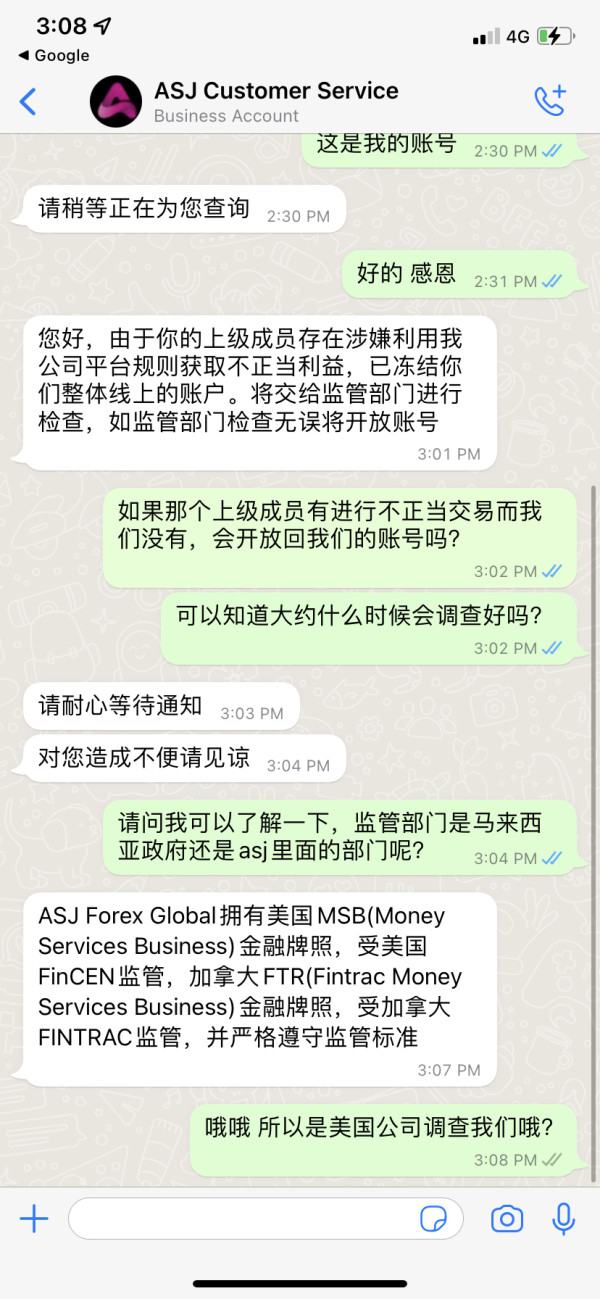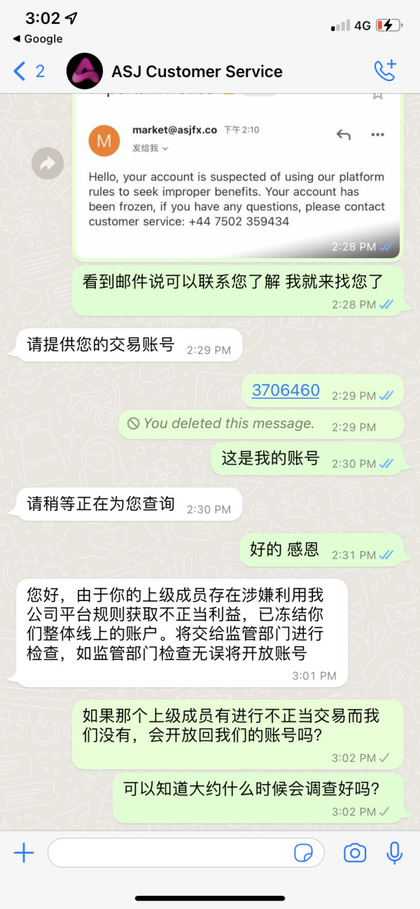 ASJ 这个公司突然在4/5/2022暂停了我的账号,使我不能交易不能登录ASJ账号了,里面的资金也因此被冻结不能出金,这很不寻常..它发来的邮件是说我的账号有用来谋取不正当的交易,事实是没有,我都是在正常交易,而且不止我一个遇到这个状况,连通我的下线我的上线通通都被封锁了,询问客服给我的理由是“您好,由于你的上级成员存在涉嫌利用我公司平台规则获取不正当利益,已冻结你们整体线上的账户。将交给监管部门进行检查,如监管部门检查无误将开放账号” 可是却给不出一个确切的期限什么时候会查好,而且上级成员出问题为什么要连通无辜的我们都要被封锁呢我不明白,请帮忙申诉我的账号被冻结的问题…我的账号是3706460