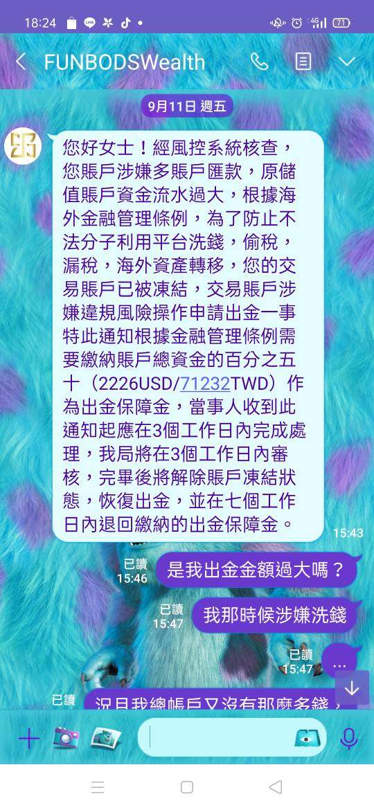 這是交易黑平台,要出金就一堆理由, 一會是帳戶有洗錢嫌疑要繳保證金, 一會是出金卡在稅務部門要繳稅金 出金的時候理由一堆,收錢就收很快 問資金進度只會回你耐心等待即可 多問幾次就叫你不要騷擾客服...