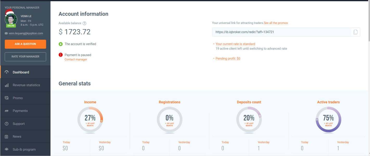 Tôi đã làm môi giớ cho Iq option hơn 1 năm nay. gần đây tôi bị khóa tài khoản, sau khi xác minh danh tính tài khoản môi giới của tôi vẫn bị khóa tiếp. phía IQ nói là nghi ngờ tôi tự giao dịch với chính link môi giới, và yêu cầu tôi phải thêm trader mới vào có volume giao dịch tương tự (Khoảng 20k$). tôi thấy rất là vô lý. Iq Option làm việc rất tệ. khuyên mọi người đừng giao dịch trên sàn này. dưới đây là doanh thu của tôi đang bị khóa lại!