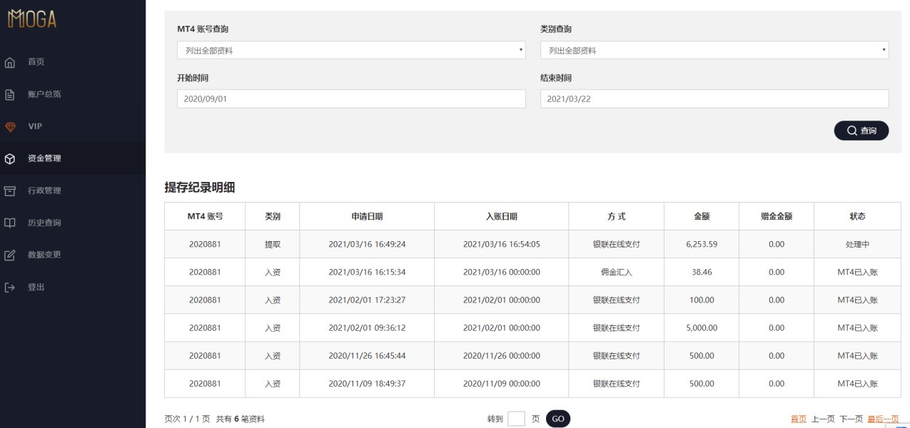 本人6月13日申请出金,当即MT4账户金额就被扣掉了。但是资金却迟迟不到账,我查阅后端,显示处理中,而业务员也离职了,根本没人对接,联系不上MOGA人员,资金也到不了账。我客户号2020881。我只是要出金拿回我基础的交易资金,希望平台帮忙。我是个有理有据的人,之前问题解决了,我就点了解决