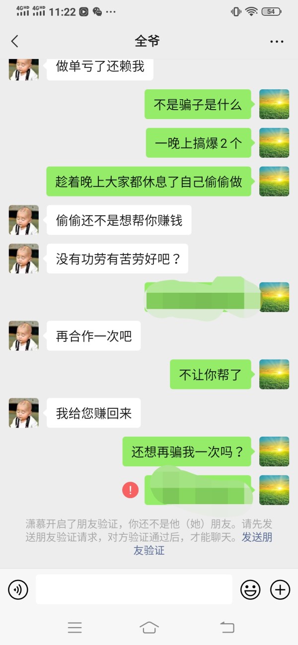 黑心代理在微信朋友圈发信息1000为诱饵,看到盈利合作,后台修改数据,一切都是假的,敢入金就叫你爆仓,血本无归,并拉黑你,记住头像不要被骗