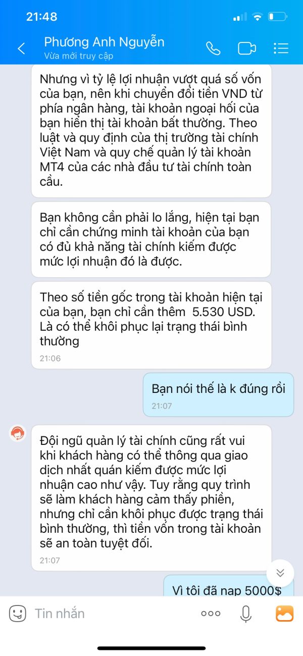 khi làm lệnh rút tiền hệ thống đã trừ tiền trong tài khoản MT4 và trong tài khoản cá nhân.Nhưng chỉ xác nhận mà không thông qua.tiền không được chuyển về tài khoản ngân hàng của tôi