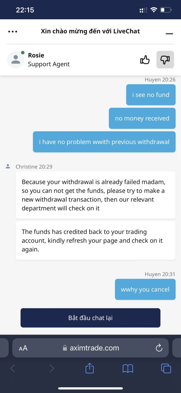 Tôi đã làm lệnh rút tiền từ 13/02/2023 nhưng Aximtrade không trả tiền, cũng không email thông báo gì, gần 24 giờ sau liên hệ sàn quanh co bảo lỗi kỹ thuật, rồi lỗi bên thanh khoản, lỗi không chuyển được sang VND và yêu cầu tôi rút lại tiền. Đến giờ tôi đã làm lại và không nhận được tiền. Nếu không nhận được vào vào ngày 15/02 tôi sẽ đăng toàn bộ bằng chứng