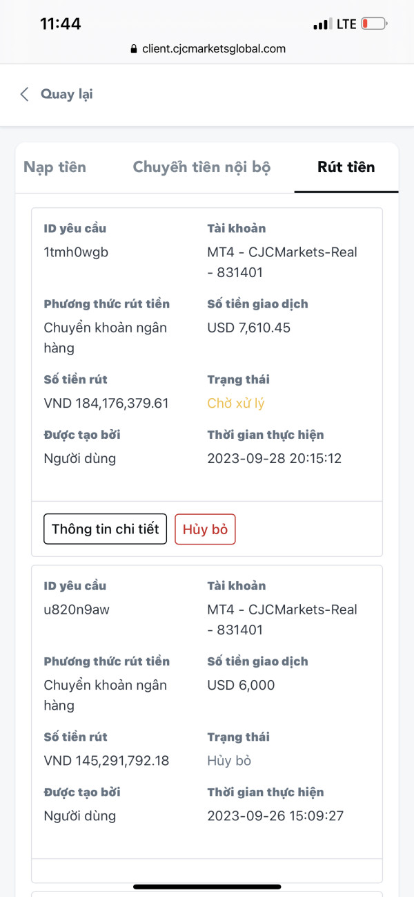 Ngày 28/09/2023 tôi đã thực hiện lệnh rút tiền nhưng sang vẫn trong trạng thái chờ xử lí. Mọi lần rút trong khoảng 1 ngày, các mail sàn đều không trả lời.