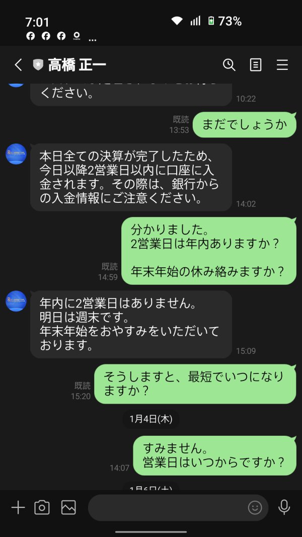 取引口座にある金額を一度Eウォレットにしてから、私の銀行口座に入金の流れで出金されます。取引口座から2回に分けて出金操作を行いました。口座へは2営業日以内で入金されるとRAYZ社の担当者が話していましたが、年末だった為、年明け後の2営業日を聞いた時点で返答なく未だに音信不通です。2回の出金操作のうち1回目は支払済となっていますが、指定した銀行口座への入金はされていません。2回目の出金操作は保留中となっています。こちら、間もなく承認される予定ですから、10日は経ちます。公式サイトの問い合わせにも書きましたが、そちらも返答なしの状態。よくあるSNSでの運用グループから指定された会社です。そちらのグループ、担当者も同様に年明け以降音信不通となっています。せめて入金した分だけでも手元に戻ればと思っていますが、解決策ありますでしょうか。