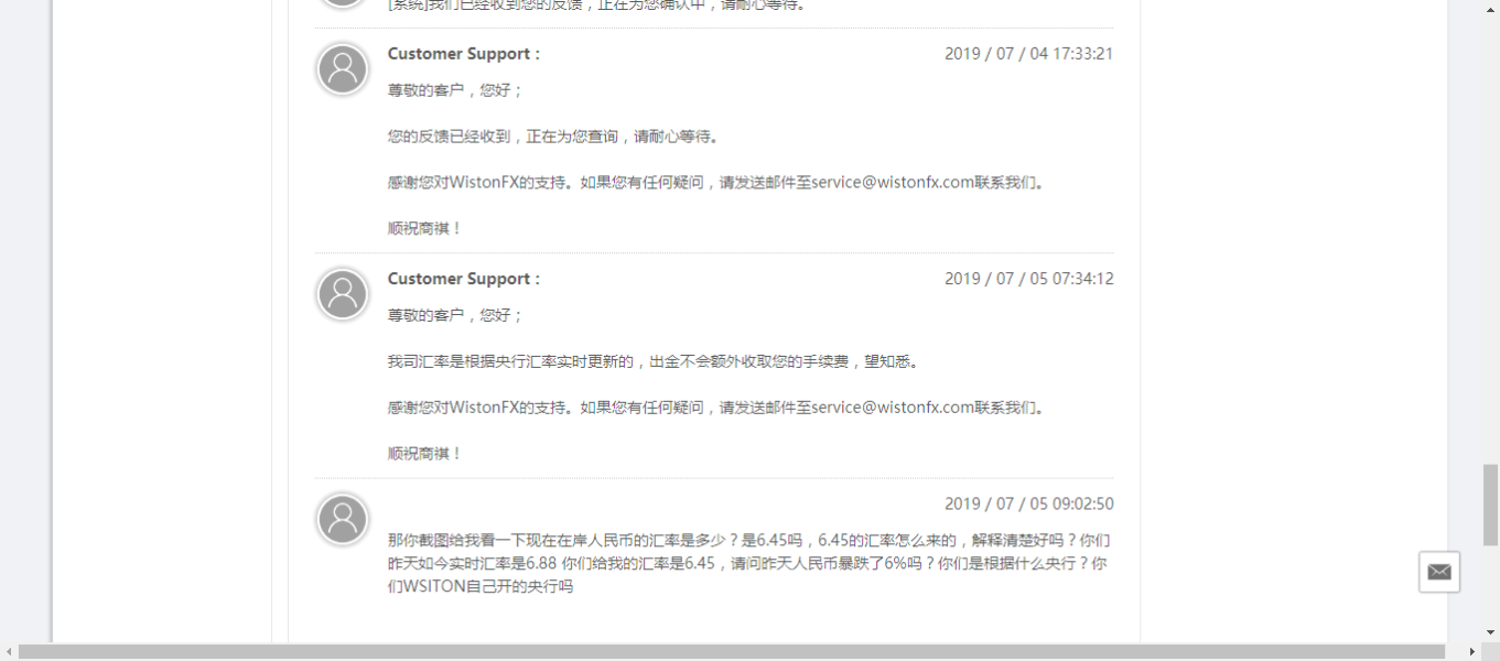Wiston平台,出金汇率只有6.45,巨坑! 在离岸人民币有6.89的时候,出金汇率只有6.45,别的平台出金都有6.75以上,wiston入金的时候6.9几的汇率,出金只有6.45,一入一出直接亏损约5%不止,比那些故意滑点的平台吃相更加难看,找客服,客服不管,发邮件,邮件不回,后台的工单系统有回复,说是根据央行汇率调整,通过第三方哪个能给出6.45的汇率出来?明明就是自己吃掉了这些钱,也不肯说是哪个第三方,建议大家原理吧,还有外汇天眼出于公正,我觉得要降低这个平台的平分,巨坑!