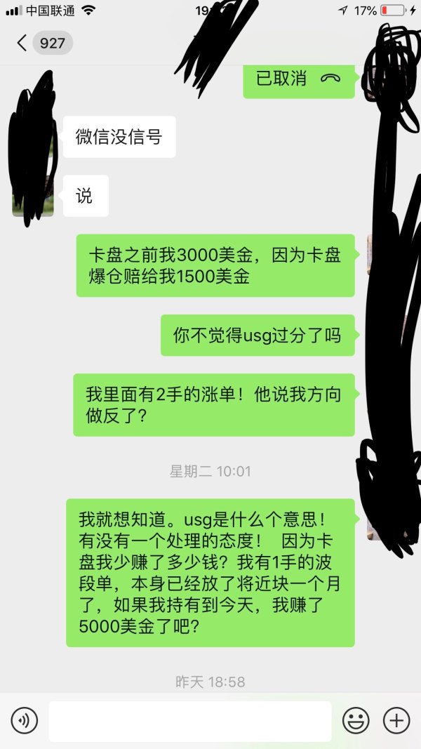 在7.31号-8.1期间的美联储利率决议 造成十来个客户严重亏损甚至个别一两个爆仓! 公司不给予相应赔偿,而且据我所知usgs卡盘多年。我以一个客户的身份告知大家。联准千万不要做,垃圾 垃圾。视频 照片证据都有,以下图片是我和我的代理商的聊天,最奇葩的是 他跟我说为什么在大行情做单!垃圾平台