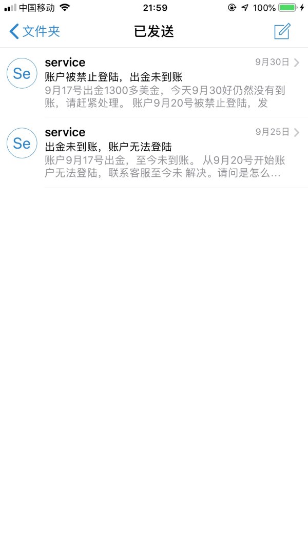 2019年9月17号申请出金1387美金,出金邮件也收到了,账户款也扣了,直到10月7号出金20天仍然未到账。发了邮件问客服也没有回复。9月20号开始账户被禁用