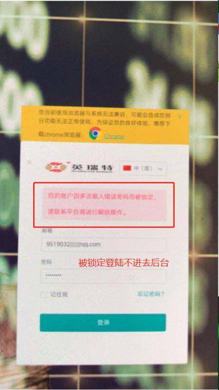 11-29号说提交的佣金能到账,2号说财务忙等3号能到账,3号上午说通道有问题要4号上午才能好,肯定能到账...5号联系没有人回复了...9号上午登录后台一次显示已审核,还是没有到账,下午就登录不进去了…… 请大家注意英瑞特这个平台是个黑平台,入进去的资金根本就出不来!!!