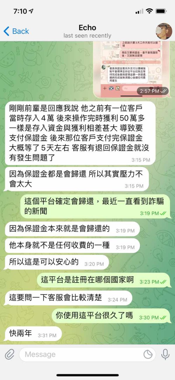 一開始是說要雇用助理,讓你協助操作平台, 之後又說公司臨時不要請助理要正職, 說要彌補我,可以給一個名額,要我聯絡專員 一開始專員很耐心問財務狀況,也入金2萬 操作完成後,專員要求先付佣金,才能提領, 於是先匯款33000給他,登入後申請提領後,平台客服說我帳戶填錯導致出金問題, 要我交易量要達到24萬多, 詢問專員怎處理,他要求要我匯款給他9萬, 但因身邊現金只有7萬,專員同意提領後再給他,一切處理好後,提款申請提出, 平台客服又說因之前帳戶問題要5個工作天, 最後盡然要我繳100800保證金才讓我出金 雇用人員:岳庭/專員:echo(一夥)
