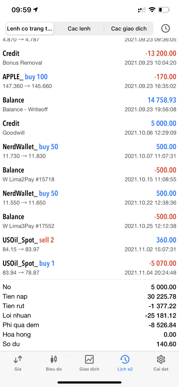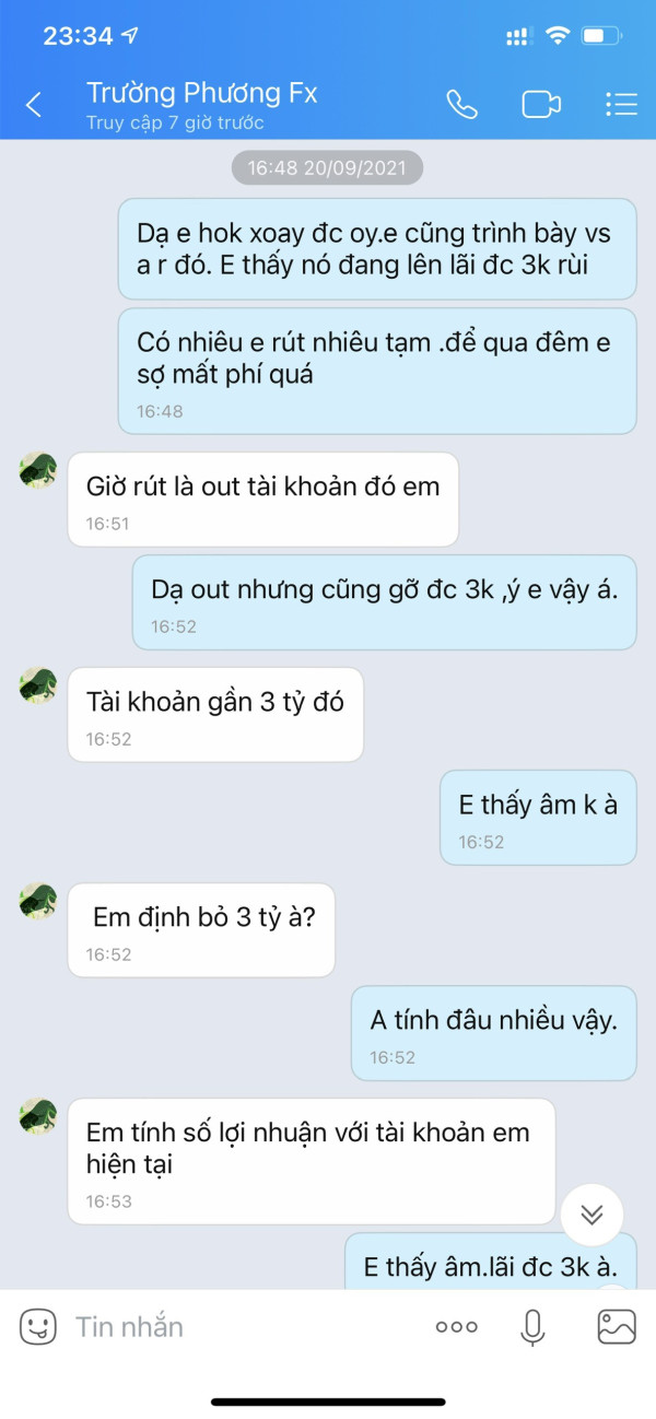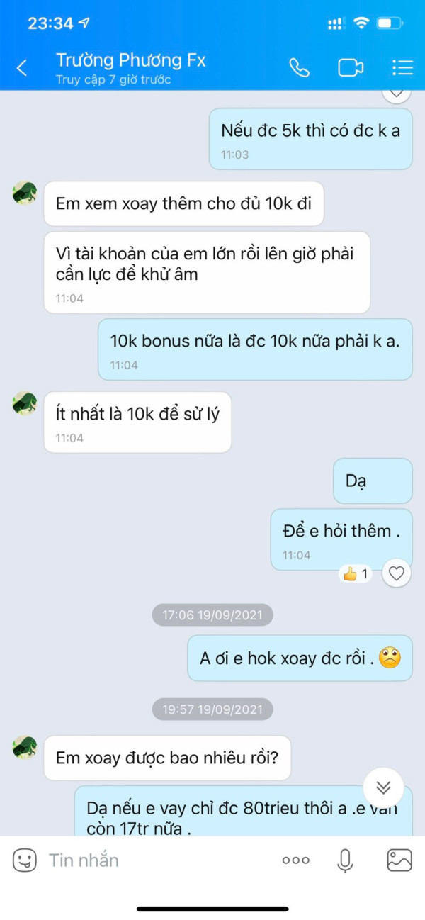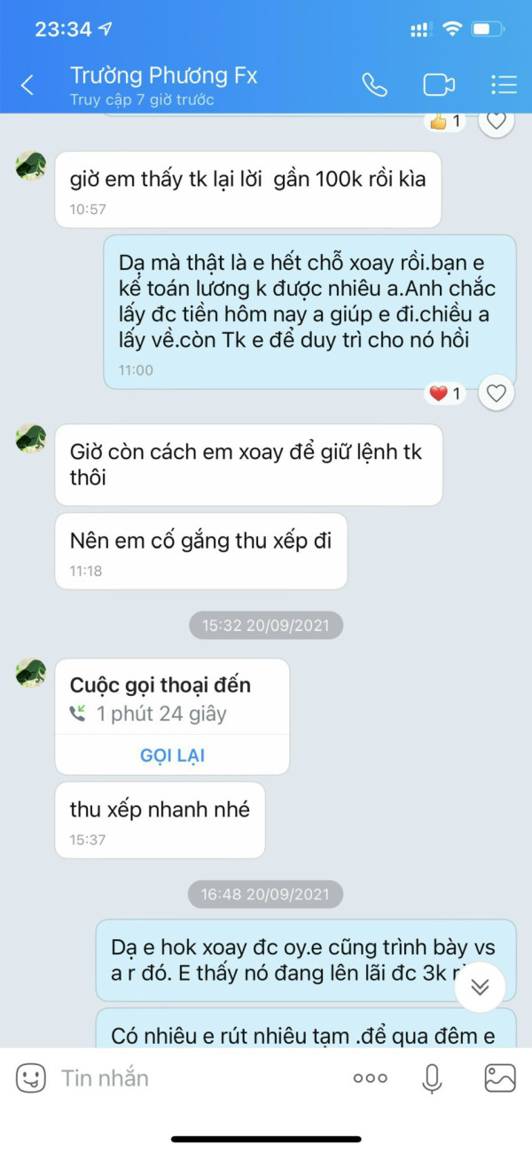 Ngày 15/09 tôi nạp 10,000$ và trong ngày họ đưa cho tôi hơn 40 lệnh và đánh lớn.Tài khoản tôi bị âm và họ yêu cầu nạp thêm để gỡ lại.Tôi nạp thêm 5,000$ nhưng vẫn bị âm .Họ tiếp tục yêu cầu tôi nạp thêm 10,000$~20,000$ nhưng tôi không thể và tài khoản bị cháy ngày 23/09 Tôi nhiều lần khiếu nại và gọi điện gửi mail nhưng họ chỉ trả 1,000$ và cố tình kéo dài việc trả tiền.Tôi nghĩ mình đã bị lừa rồi.Hãy liên hệ tôi.0906953984.Hãy cảnh giác với nó.Lúc đầu nó cho bạn vào nhóm đầu tư và ai cũng lãi