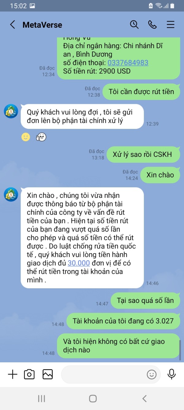 tôi muốn rút về 3000$ nhưng CSKH từ chối và không trả lời.Sau đó lại yêu cầu tôi nạp thêm 30.000 mới cho rút toàn bộ về.Xin được hỗ trợ bồi thường