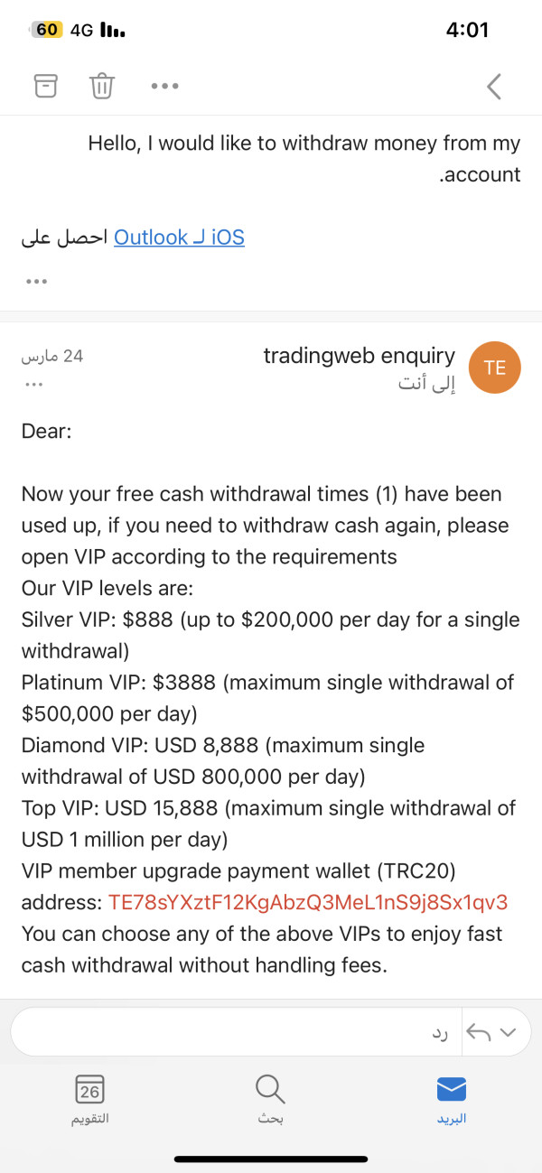 تواصلت معي فتاة وتدعي ان عمها يعمل في تجارة الذهب وان لديه محللين خاصين وانهم يكسبون الكثير من المال ,, وانها فتاة مديرة شركة اجهزة طبية ,, من هونج كونج,, عندما وضعة اموالي في هذه المنصة ,, انني غير قادر على سحب الاموال .. اتمنى من الجميع الحذر