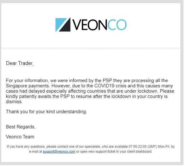 Hi all,I initiated my withdrawal one week ago as of 13th May 2020. It was stated very clearly that it will take between 3-5 working days. However, as of 20th My 2020, I received this notification from Veonco. I think this is very unprofessional. Moving forward, I do hope that they hold true to their words.RegardsUser