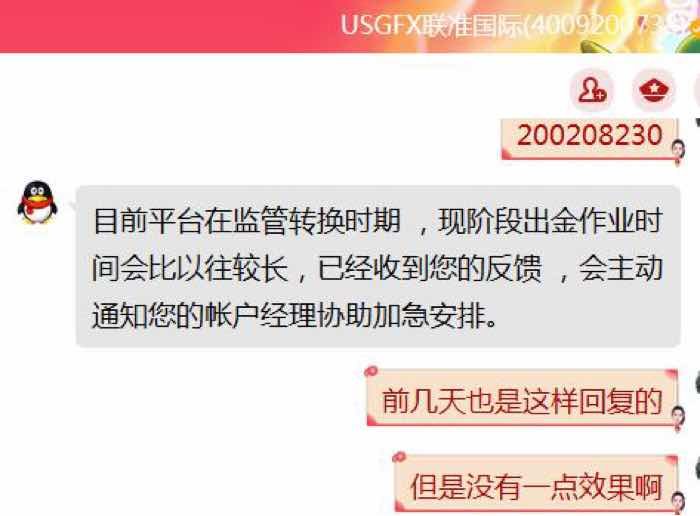 我在联准国际8月13号就已经申请出金,已经六天了还没有到账,客服老是一句话重复回复,账号200208230