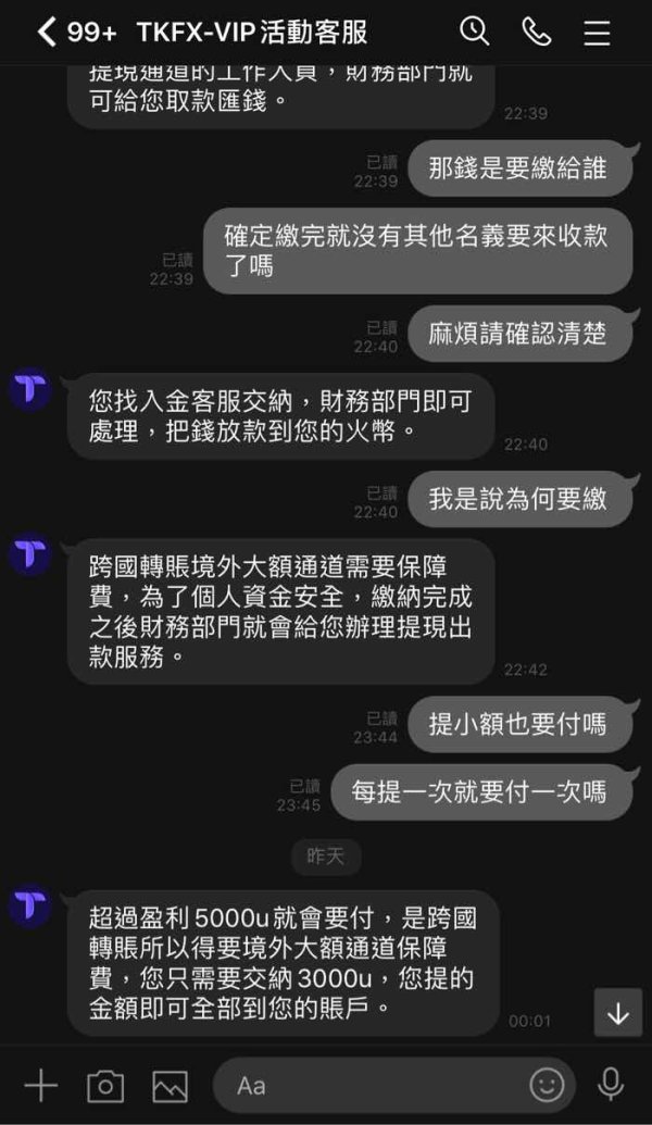 網路交友被套路了 介紹這個TKFX讓我投資 這個平台的出金過程曲折起伏 不是繳稅就是繳什麼罰金保證金等等的 目前剩最後一個「境外大額通道保障費」要繳交 但我怕繳了之後,出金的錢是去了別人的帳戶 懇請平台能夠協助 感謝 (約兩個小時前有發佈一篇無法出金,原想在同一篇補充說明,但是似乎無法修改內容,故在此重新發佈一篇,請見諒)
