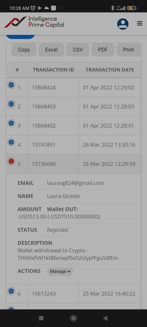 hola , tengo 2 retiros pendientes, 1 del 26 de Marzo del 2022 , de 513 dólares y me sale rechazado, y no se refleja el reembolso en ningún lado y el otro es de 800 dólares, del 1 de abril y me sale en pendiente, quisiera por favor que me ayuden a resolver mi correo de IPC es lauravg824@gmail.com y mi ID IB333597 el ID de transacción del primer retiro del 26 de marzo por 513 dólares es 15736686 y del 1 de abril de 800 dólares el ID es 15868424, le agradezco su pronta respuesta