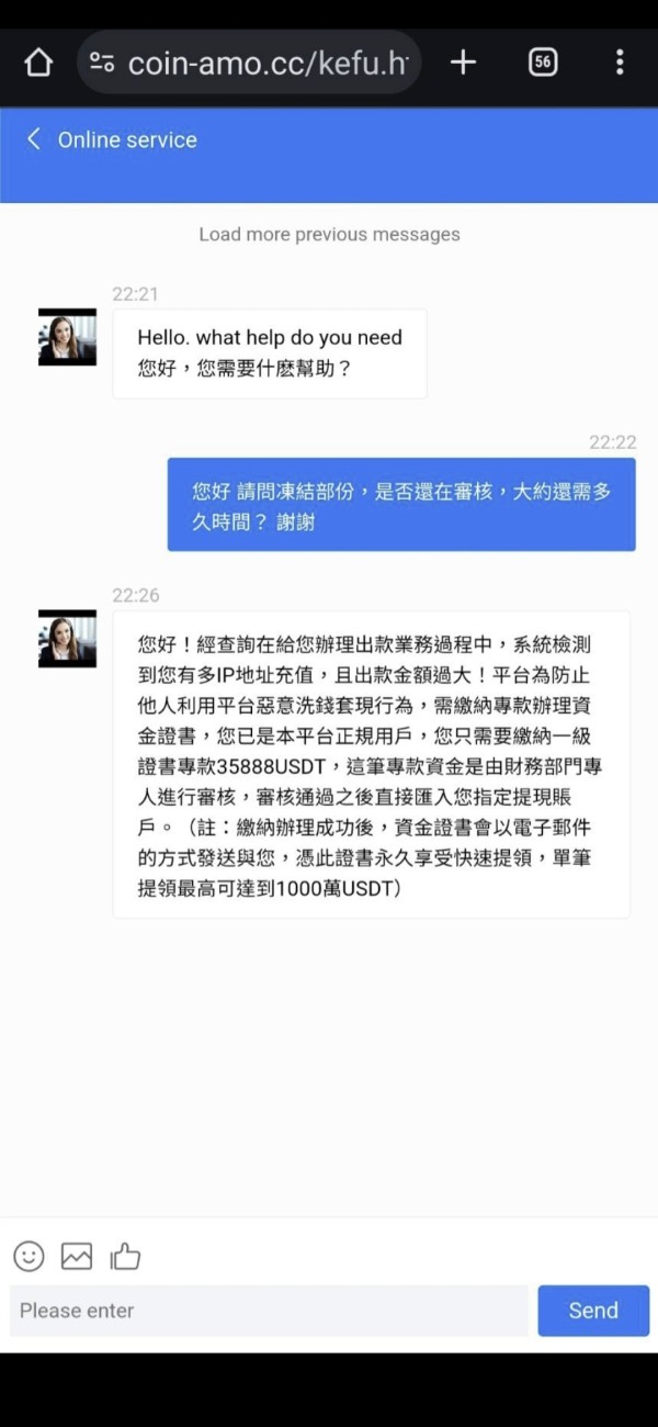 原平台網址 coin-ayo.cc/h5 已關 變更為 https://coin-bmo.cc/h5/#/ 為領取新人福利(當時未截圖)加上投資獲利後,要求出金,客服稱金額過大,需繳交證書專款,繳交後,又稱需繳交稅金 因無法再湊足稅金全額,至今無法出金 全是借貸投資,已投入約 $USD 114320 只想儘快拿回