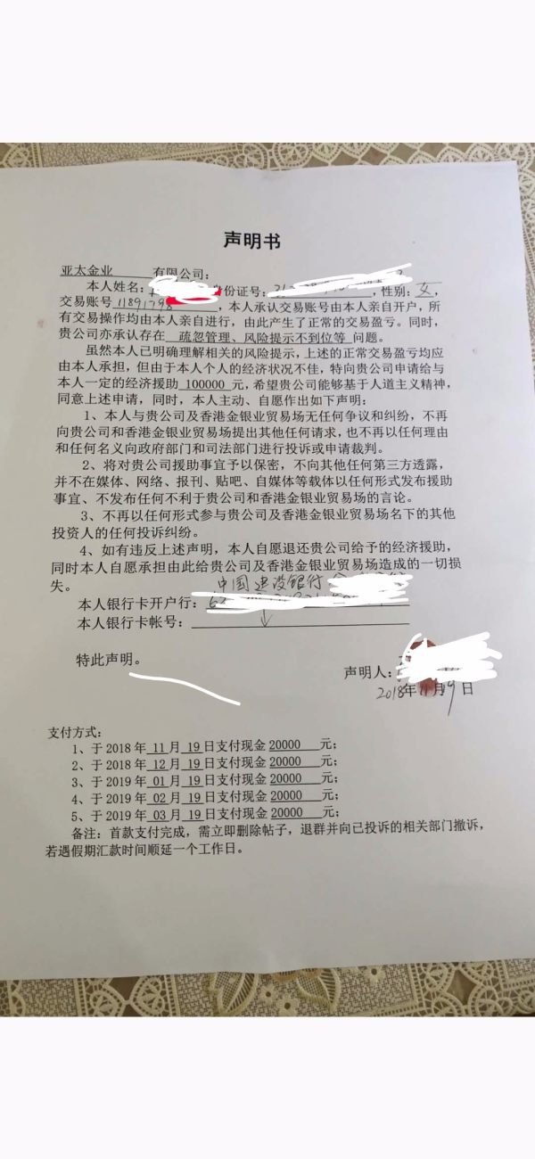 我是2018年7月被人拉群炒股,谁知是炒黄金,被骗20万人民币,后来找了他们所谓的负责人,答应赔偿一半,我想就算了,另一半权当买个教训,他们写了个声明,分五次付款,但里面有个规定事项就是不能找维权公司,我想能回来些钱谁也不会傻到请维权,谁知这个是亚太金业的一个套中套,前两天他们说我找了第三方,我一看有点懵,后来仔细看了才发现照片有问题,因为这张照片只有亚太金业一个叫李扬的有,这不是明摆了要赖皮剩下的赔偿款吗?