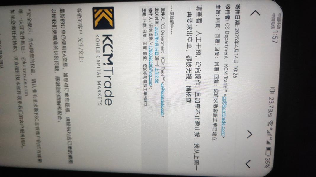 kcm就是个诈骗平台!起初就在做公益立人设和稳定利益诱导小白,承诺年0.5-1.5倍收益,获得用户信任之后,kcm平台人员就开始恶意操控EA,多次违背我的意愿反向操作,故意加大高风险交易,我多次反馈申诉给平台无果导致爆仓,我会一直曝光骗子平台,,还我血汗钱!