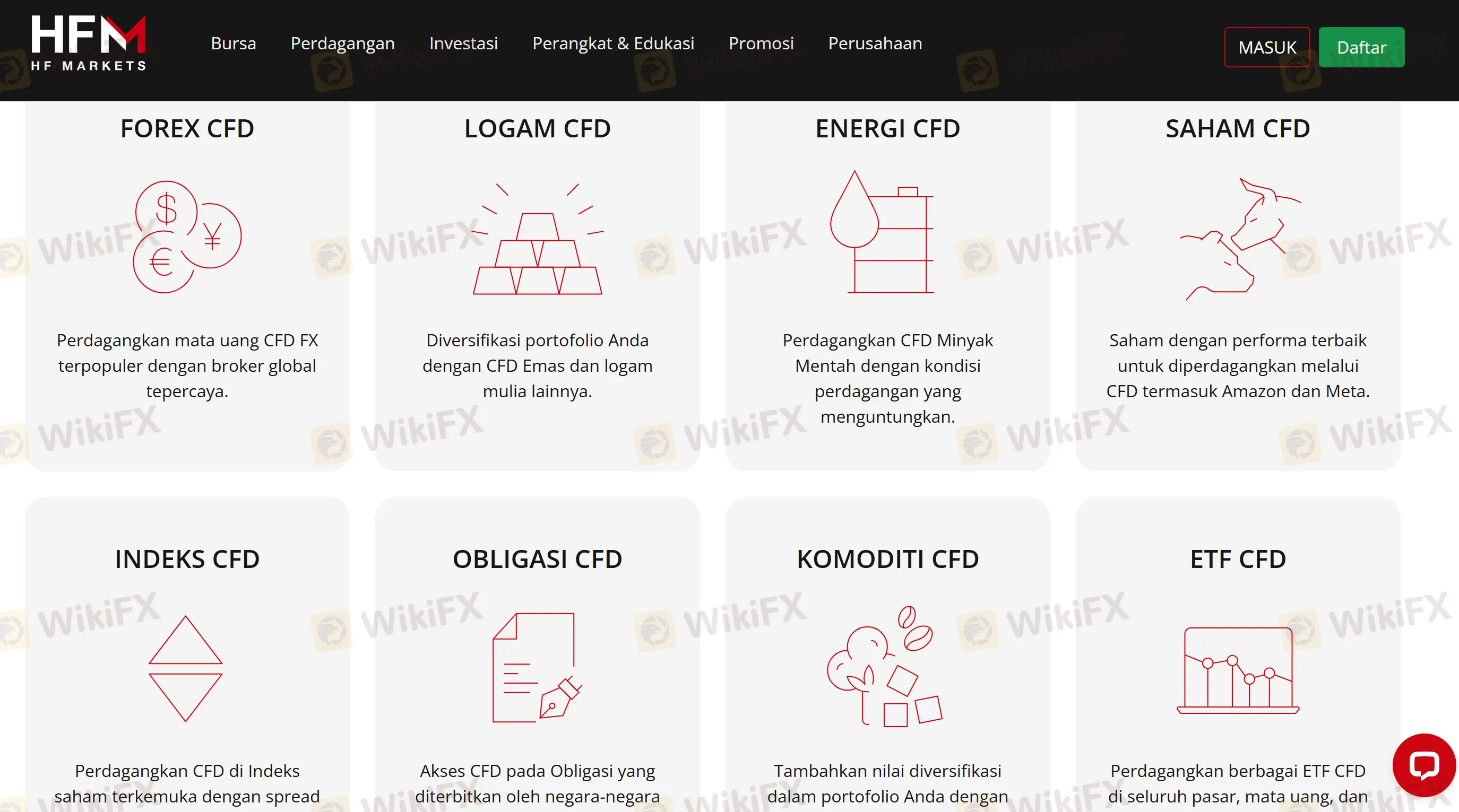 HFM menyediakan CFD atas Forex, Metals, Energies, Indices, Stocks, Commodities, Bonds, ETFs, dan Cryptocurrencies. Eksekusi tersedia di MT4, MT5, WebTerminal, serta aplikasi HFM (iOS/Android). Beberapa kelas aset—seperti Crypto dan ETF—tersedia khusus di MT5 dan platform/aplikasi HFM.