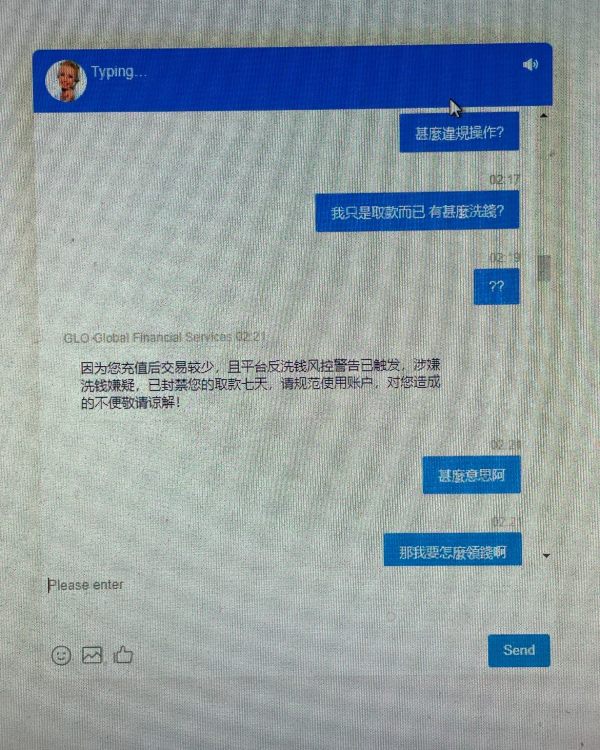 入金時客服回復速度迅速有效率,出金時卻百般刁難鬼打牆 1.我在他們規定時間內提交出金申請,卻被以超過出金時間為由拒絕 2.隔幾天我再次申請出金,卻說我的帳戶因為入金後交易次數太少,所以觸發了洗錢風控警告禁止取款七天,並跟我說如果想要取款,在這七天內要我多次進行交易以活躍帳號才能取款 GLO FINANCE是個非常黑心的詐騙平台,完全沒有道理的冷凍我帳戶不給取款.還要我多次交易來擺脫嫌疑,完全是藉口!更可笑的是客服說可以持續入金但是不能出金,真是莫名其妙 有夠荒唐~我會不斷地持續爆料,實在有夠扯,請大家務必遠離!! 此筆金額對我來說非常重要,是救命錢,請拜託幫我協調救救我~謝謝!