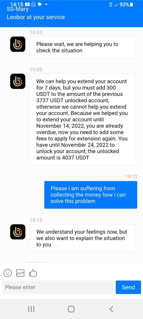 Yesterday I coated with leobor customer service they extended the time to pay for 7 days but ask for 300$ more now they need me to pay 4037$ to activate my account