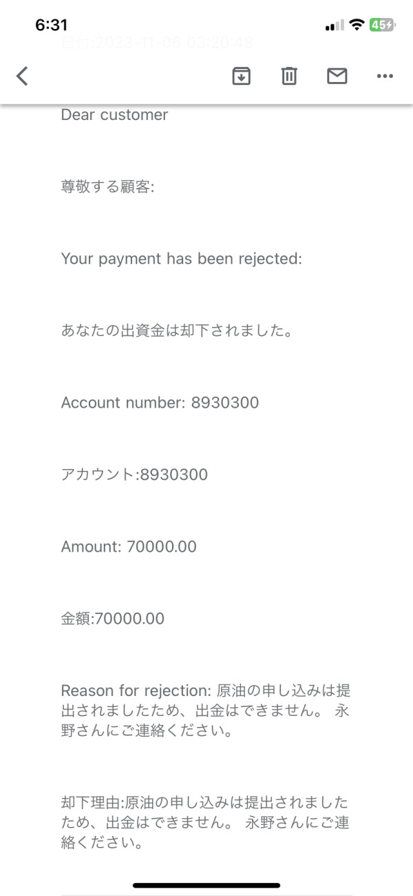 原油予約中は出金できません。その次は指導料払わないと出金できません。等等、いろんな理由をつけて出金を拒否します。 何とか解決できれば嬉しいです。