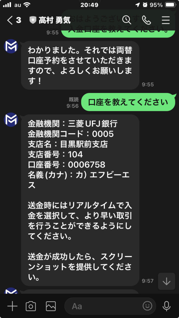 Sono stato introdotto al gruppo LINE tramite SNS e ho partecipato a una sessione di studio organizzata da Shuichi Sasagawa. Dopo di che, mi è stato presentato Yuki Takamura di MGL Global da Yoko Takahashi, un membro del gruppo, e su invito di Takamura, ho aperto un conto di gestione degli investimenti. Successivamente, su istruzioni di Takamura, sono stati trasferiti più volte un totale di 10.500.000 yen. Riguardo al motivo per cui la destinazione del trasferimento non è a nome di MGL ma a nome di un'altra società in Giappone, Takamura ha detto: "Per convertire da yen a dollari prima del bonifico, è necessario trasferire i soldi su un conto con un nome diverso". C'è una spiegazione. Contesto che ha portato a questo accordo: 1. Ho visto un gruppo di studio sugli investimenti delle scuole superiori intervistato da Shuichi Sasagawa su SNS e mi sono unito allo stesso gruppo LINE. 2. Yoko Takahashi ha presentato MGL Yuki Takamura al gruppo LINE registrato. 3. Yuki Takamura mi ha incoraggiato a fare trading presso MGL e ho aperto un conto. Dopo di che, i fondi di investimento verranno trasferiti sulla banca secondo le istruzioni di Takamura. 4. Sono stato introdotto a BTCUSD su LINE, un gruppo guidato da Shuichi Sasagawa, e ogni volta ho ricevuto istruzioni per depositare ulteriori fondi per la gestione degli investimenti e ho effettuato il trasferimento perché mi è stato detto che il rischio di trading aumenterebbe se avessi avuto pochi fondi. Dopo di che, Yuki Takamura gli ha detto che "Minoru Fukuda" (mentore di Shuichi Sasagawa) gli aveva offerto una priorità per fare trading in petrolio greggio, quindi investiamo, quindi ha iniziato a fare trading in petrolio greggio. 5. Dopo il regolamento del petrolio, chiede a Takamura di ritirare i soldi, ma riceve una richiesta di denaro di cui non era stato informato fin dall'inizio, come ad esempio "Dovrai pagare una tassa di guida di 5 milioni di yen per ritirare i soldi". Ho accettato la richiesta e ho effettuato il deposito, ma questa volta mi è stato detto che dovevo pagare 20 milioni di yen di tasse, quindi mi è stato chiesto di effettuare nuovamente il bonifico. Questo ovviamente sarà rifiutato. Yuki Takamura di MGL Global, Shuichi Sasagawa, Minoru Fukuda (Minoru Fukuda), Yoko Takahashi e altri sono sicuramente un gruppo di truffatori. Sto anche andando dalla polizia. Dovremmo perdonare un gruppo di truffatori del genere?