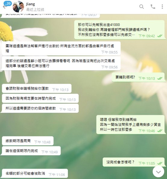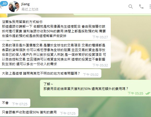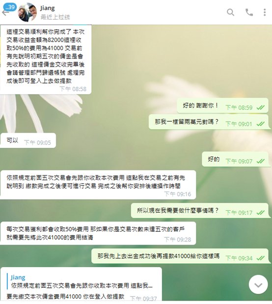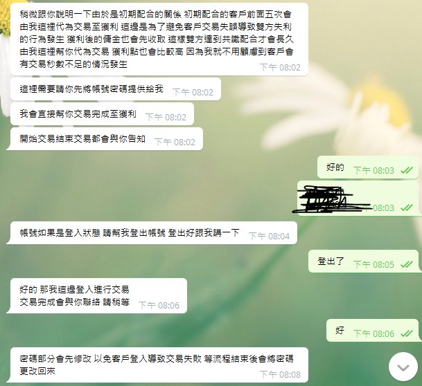 原先是在臉書平台IG看到兼職,加入Line後雇主自稱有再投資外匯平台,但是人在國外無法登入這個平台網站所以才要找人幫忙代操,然後就配合他給我的專員對方下指令我照做之後雇主說因為家裡有事情所以沒有要繼續代操,專員那邊還有名額可以讓給我一開始講好遊戲規則,就是他下指令我自己操作之後收取50%傭金,模式就如同我幫雇主操作一樣然後問一堆經濟狀況叫我入金兩萬,當天晚上又臨時說前面五次會先幫我代操請我給他帳密,對方拿到手後就說要改我密碼以免我登入後導致她虧損爾後就叫我繳代操費41000才可以把帳號還給我,請他幫我出金他又說他們規定不行一定要先收到客人的傭金才可以然後我就開始察覺有異狀,反正就是我不給傭金他不還我帳號 非常惡劣