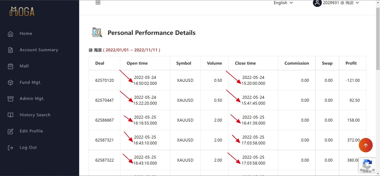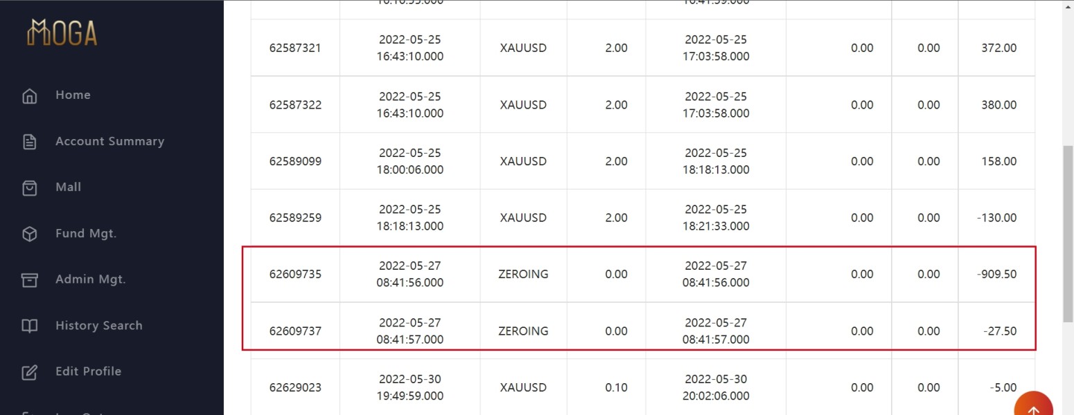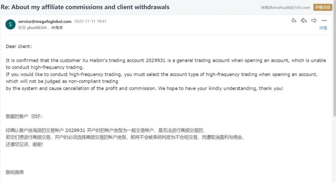 本人在Mogafx的交易账户为2029931,于2022年5月13日入金2000美金,并于2022年5月24日开始交易,总共盈利909.5+27.5美金,所有交易单子的时间都是几分钟到几个小时,Mogafx官方答复说因高频交易导致盈利和佣金取消,这是不是欲加之罪,何患无辞?请求帮我拿回盈利937美金