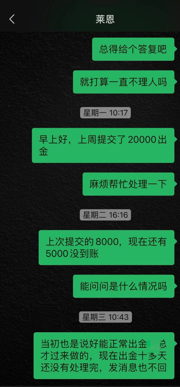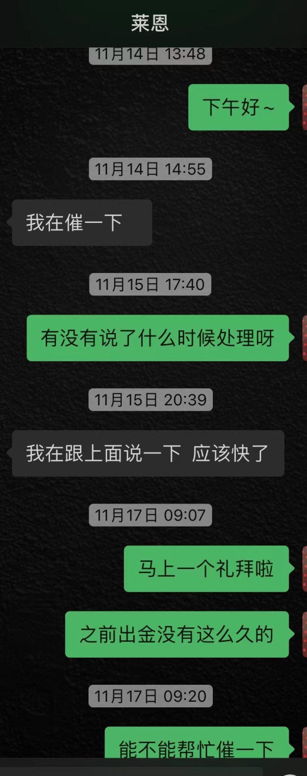 我当初决定来贵平台做交易也是因为客户经理承诺我可以正常出金,之前跟贵平台对接的也很紧密,如果不允诺我可以正常出金我是不会去做交易的,我都是正常做交易的,之前一直在亏,最近盈利想要出金就恶意卡资金,客户经理自从我提交出金以后就基本不回复消息了,这样的态度让我很失望,其他人看到贵平台这样的态度还敢入金做交易吗?我现在的诉求是请贵平台尽快处理我的出金,我不想听到还在排队这样的理由,在我看来都是借口。图片是我跟客户经理的对话,还有后台发的照会,后台出金记录