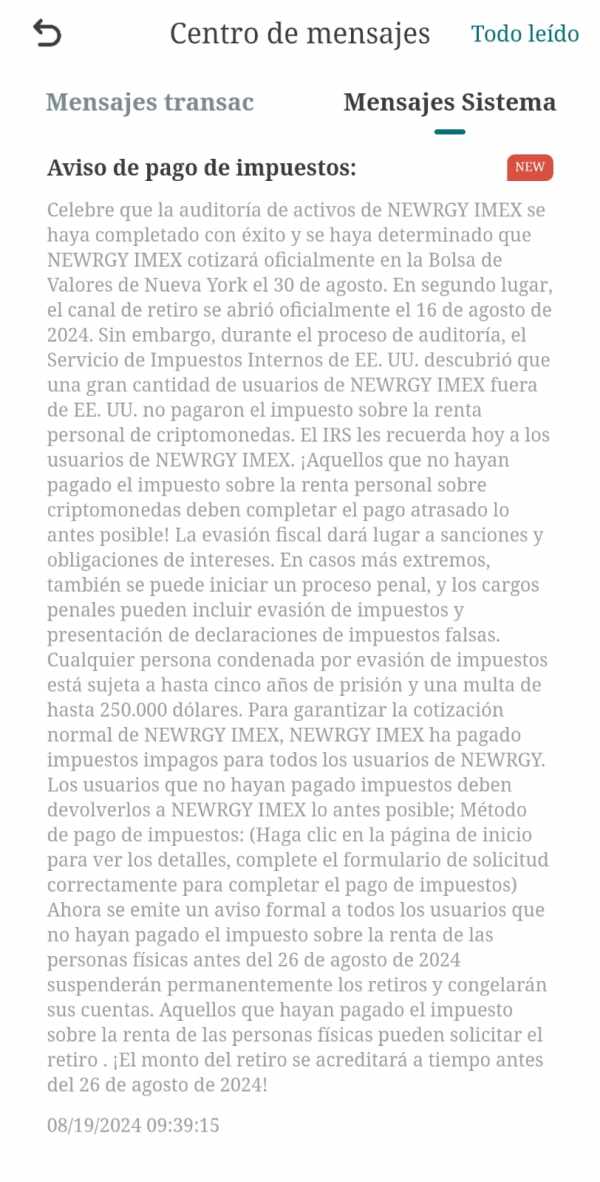 Denuncio a NEWRGY IMEX por posible fraude. Desde hace dos semanas, mis retiros están bloqueados con el pretexto de una auditoría para cotizar en la Bolsa de Valores de NY. Se prometió desbloquear el 16 de agosto, pero no fue posible por el fin de semana. Hoy, se exige un impuesto del 20% para retirar, con un 5% adicional diario por morosidad Solicito una investigación urgente.